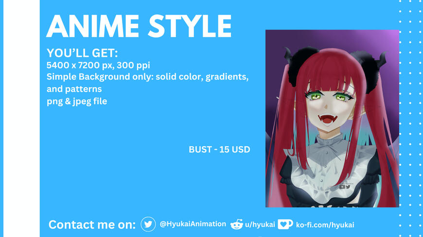 Other requests are negotiableTerms of ServicesCommissioning the artist must mean you've read and agreed to the following conditionsPAYMENT• Full payment is required before I begin my work.• Paypal / Gcash (USD based)• There will be no refunds from the client side whatsoever. Please be certain you wish to purchase my services before doing so.• Refund may be given if I am unable to complete your commission for any given reason.• If a refund is made, the artist will have the full right to recycle/reuse the art.REFERENCES• Provide all the necessary reference materials for your piece. Both visual and written references are accepted. (written references must be specific to have a smoother process)REVISIONS• I don't do major revisions like changing the concept and character. So that you have to discuss your ideas first with me :)DEADLINES AND DELIVERY• Artworks may take 14-21 days to complete.• Deadlines are accepted as long as you warn the artist beforehand.• I will update you directly about the artwork or delays.• The artist is a student therefore the schedule may change.COPYRIGHT / USAGE POLICY• Commissioned art may be used for personal use but cannot claim it as their work. Reposting the commissioned art online is allowed but you must credit me.• I own all the rights to the artwork along with the rights to post my artwork to promote myself and my art.• It is prohibited to use my artwork for commercial use.